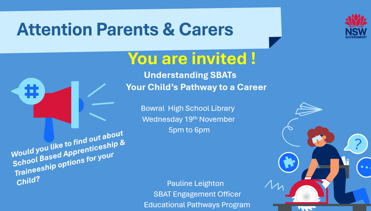 Parents and students are invited to attend our SBAT Information Night. Run by Pauline Leighton, SBAT Engagement Officer, this night gives students and parents information regarding School Based Apprenticeships for the final two years of high school.